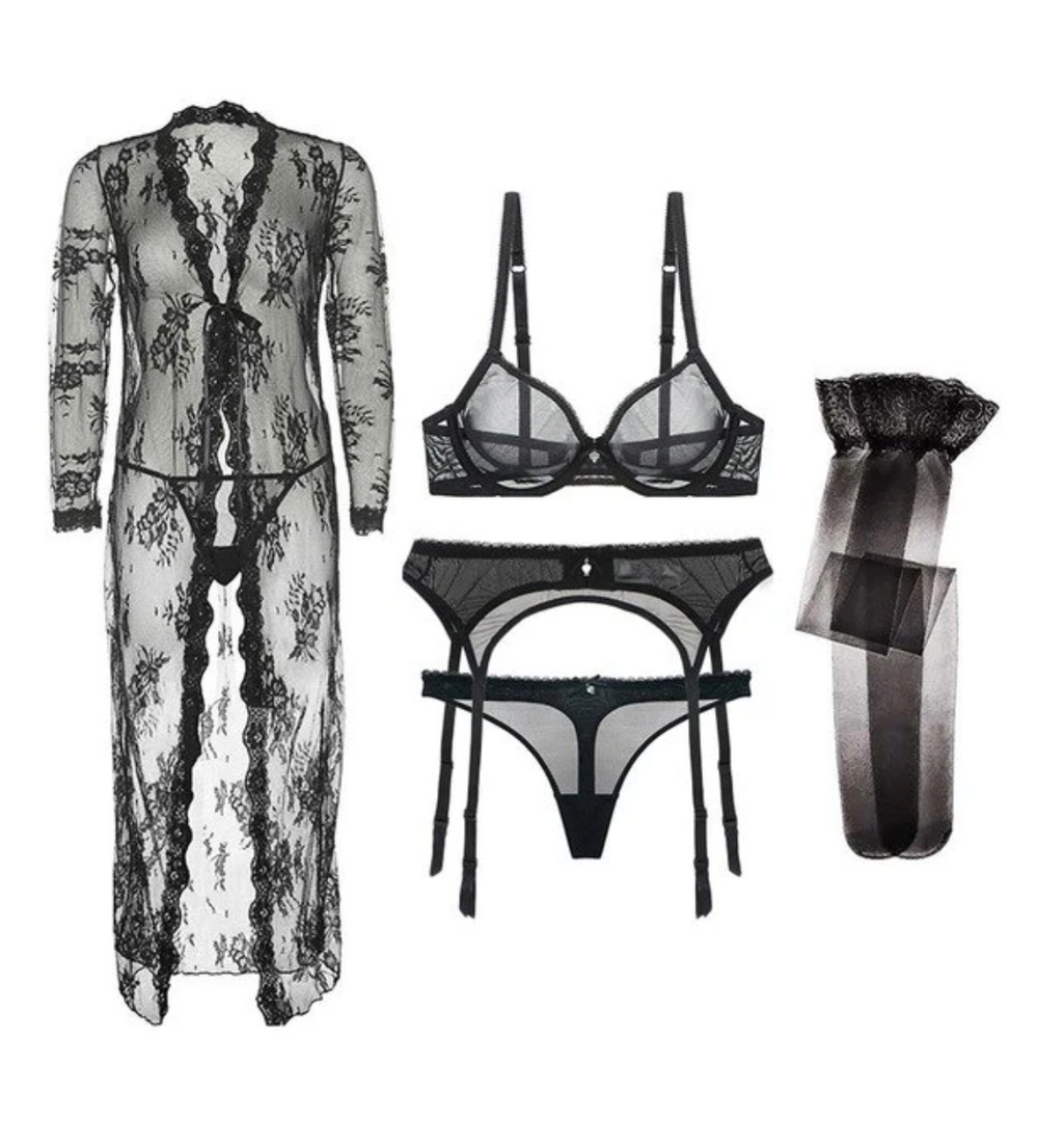 Ultra Thin See-Through 3/4 Cup Bra With Matching Thong, Garter, Stockings With Lace See Thru Robe